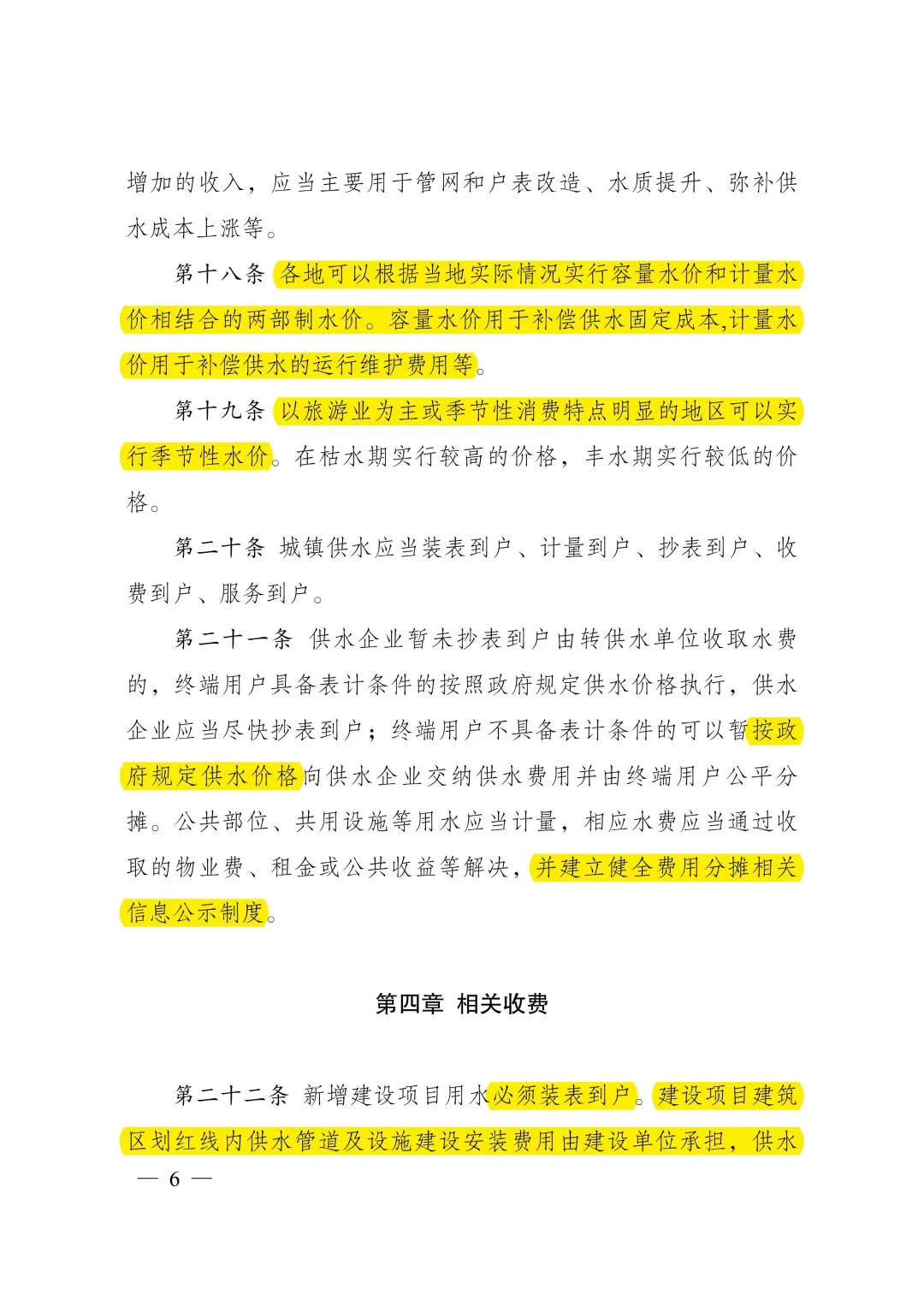 答:《城鎮(zhèn)供水價格管理辦法》明確了城鎮(zhèn)供水價格的定價原則、定價方法、定調(diào)價程序,以及水價分類、計(jì)價方式、規(guī)范供水企業(yè)服務(wù)收費(fèi)行為等。主要內(nèi)容:一是按照“準(zhǔn)許成本加合理收益”的方法核定城鎮(zhèn)供水價格。制定城鎮(zhèn)供水價格,以成本監(jiān)審為基礎(chǔ),通過核定準(zhǔn)許成本、監(jiān)管準(zhǔn)許收益確定準(zhǔn)許收入,根據(jù)核定供水量確定供水價格,并統(tǒng)籌考慮當(dāng)?shù)毓┧聵I(yè)發(fā)展需要、促進(jìn)節(jié)約用水、社會承受能力、服務(wù)質(zhì)量等因素。二是簡化水價分類、明確計(jì)價方式。城鎮(zhèn)供水根據(jù)使用性質(zhì)分為居民生活用水、非居民用水、特種用水三類,居民生活用水實(shí)行階梯水價制度、非居民用水實(shí)行超定額累進(jìn)加價制度。三是規(guī)范定調(diào)價程序、強(qiáng)化信息公開。要求制定居民生活用水價格水平或定價機(jī)制應(yīng)當(dāng)按照價格聽證的有關(guān)規(guī)定開展聽證,并進(jìn)行信息公開。四是規(guī)范服務(wù)收費(fèi)行為、提升服務(wù)質(zhì)量。明確供水水質(zhì)、水壓應(yīng)當(dāng)符合國家規(guī)定標(biāo)準(zhǔn)。除受用戶委托開展的建設(shè)安裝工程費(fèi)用外,供水企業(yè)不得濫用壟斷地位收取供水開戶費(fèi)、接入費(fèi)、增容費(fèi)等費(fèi)用。