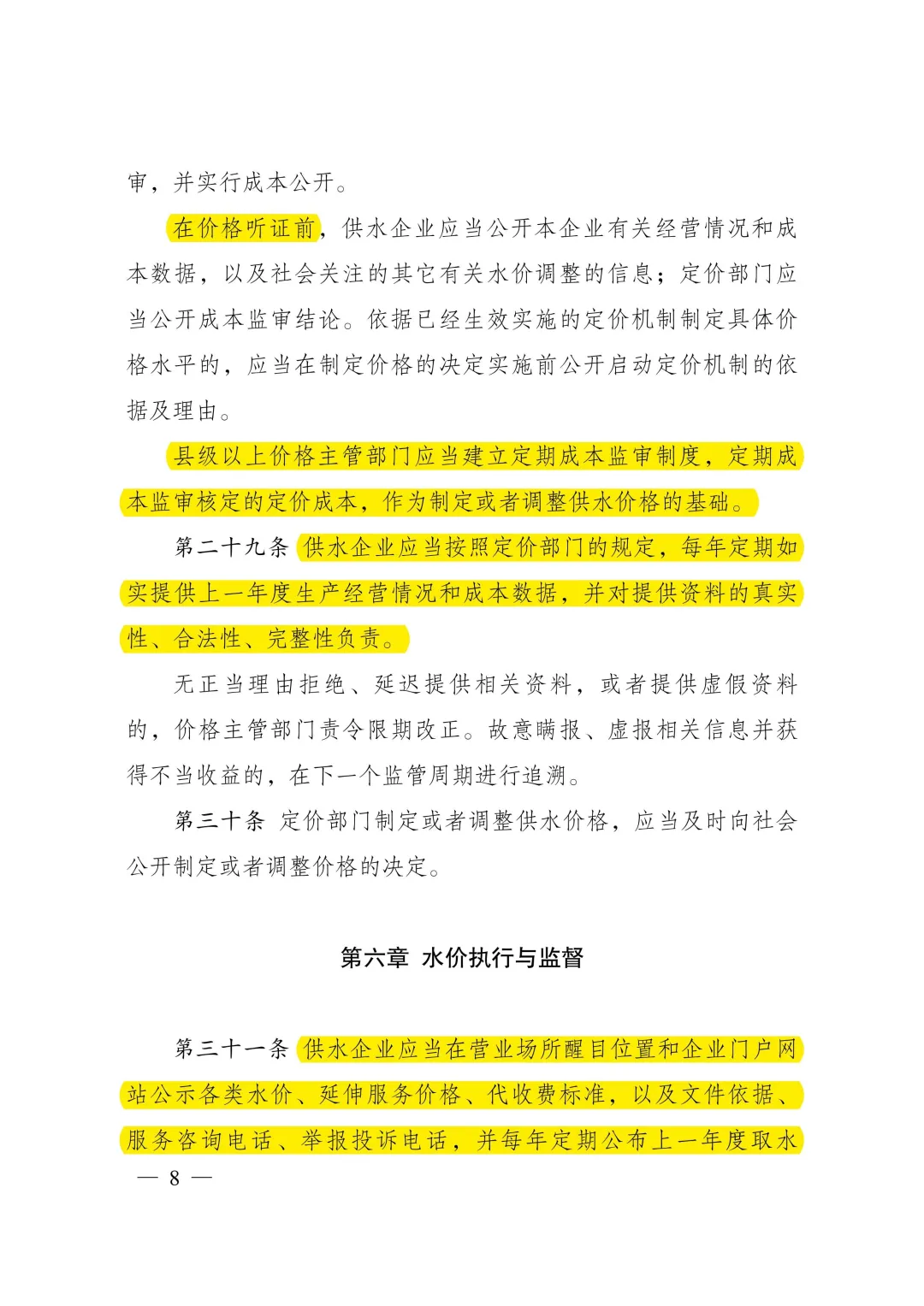 《城鎮(zhèn)供水定價成本監(jiān)審辦法》明確了定價成本構(gòu)成和核定方法。主要內(nèi)容:一是明確城鎮(zhèn)供水定價成本構(gòu)成范圍。按照合法性、相關(guān)性、合理性原則,規(guī)定城鎮(zhèn)供水定價成本包括固定資產(chǎn)折舊費(fèi)、無形資產(chǎn)攤銷和運(yùn)行維護(hù)費(fèi),并對計(jì)入定價成本的項(xiàng)目作了具體規(guī)定。二是明確定價成本和有效資產(chǎn)核定方法。細(xì)化明確固定資產(chǎn)折舊、原水費(fèi)、材料費(fèi)、動力費(fèi)、人工費(fèi)等成本費(fèi)用的審核標(biāo)準(zhǔn),對可計(jì)提收益的有效資產(chǎn)范圍及其核定方法做出明確規(guī)定,對供水企業(yè)職工人數(shù)定員、管網(wǎng)漏損率控制等建立激勵約束機(jī)制。