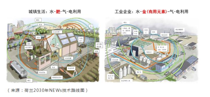 縱觀國際,諸如美國、加拿大、丹麥、英國、荷蘭、新加坡、德國、日本等發(fā)達(dá)國家,都是水處理行業(yè)創(chuàng)新比較活躍的代表,在碳中和體系下,這些國家圍繞相關(guān)的規(guī)劃、技術(shù)布局與創(chuàng)新、未來發(fā)展導(dǎo)向等做了大量工作??梢钥闯觯芏嗟湫偷奈鬯畯S已經(jīng)在向新生水源廠、有機(jī)肥廠、能源輸出工廠轉(zhuǎn)變。以荷蘭為例,其針對城鎮(zhèn)生活和工業(yè)廢水,建立了面向未來的污水處理資源/能源利用模式。