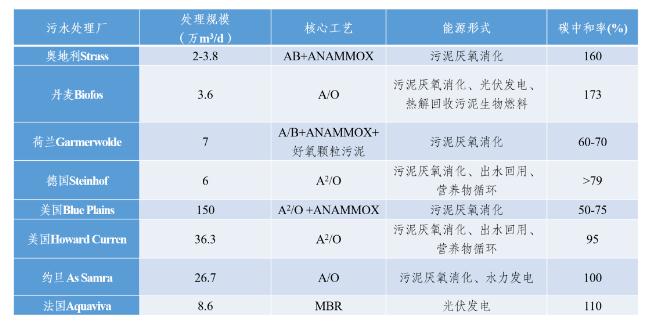 以下是國外相關(guān)污水處理廠通過能源利用或相關(guān)技術(shù)革新實(shí)現(xiàn)碳中和的代表案例。可看出,一些污水處理廠已實(shí)現(xiàn)100%能量自給,達(dá)到碳中和。