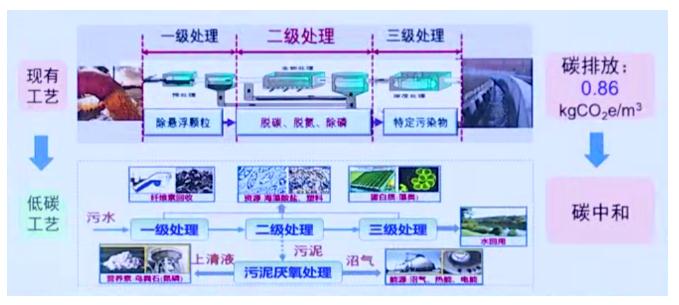要把污水處理廠的碳排放強(qiáng)度由當(dāng)前的0.86 kgco?e/m3降為0,在工藝上,就需從常規(guī)的三級處理向每一環(huán)節(jié)強(qiáng)化碳捕獲與利用轉(zhuǎn)變。其中關(guān)鍵技術(shù)創(chuàng)新在于“能源供給+碳源捕獲+深度脫氮+污泥厭氧消化”。
