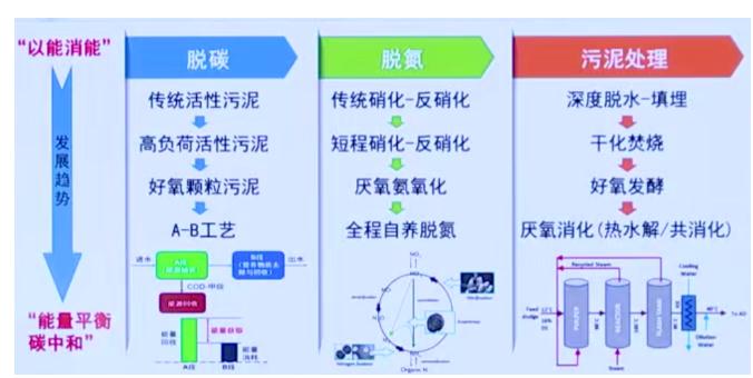 圍繞工藝的轉(zhuǎn)變,污水處理技術(shù)要從“以能消能”到能量平衡、“碳中和”轉(zhuǎn)變。其中,脫碳體系要重點(diǎn)關(guān)注a-b法和整體營養(yǎng)物回收,這是主流工藝的未來;脫氮方面,主要聚焦自養(yǎng)脫氮技術(shù);此外,污泥處理,從傳統(tǒng)的脫水-填埋到碳化、能源化轉(zhuǎn)變,在碳中和形勢下會有巨大潛力。