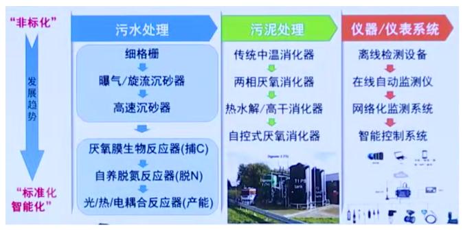 裝備是實(shí)施污水處理技術(shù)工藝實(shí)現(xiàn)的載體。污水處理廠從最前端的格柵到后面主體工藝的各種反應(yīng)器,到污泥處理設(shè)備,包括整個(gè)流程智能控制的儀器儀表,都是實(shí)現(xiàn)碳中和不可忽視的內(nèi)容。未來裝備的發(fā)展趨勢必然是從“非標(biāo)化”逐步邁向“標(biāo)準(zhǔn)化”、“智能化”。