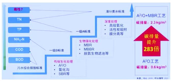 我國污水處理出水水質(zhì)標(biāo)準(zhǔn)不斷提高,傳統(tǒng)工藝在實(shí)現(xiàn)達(dá)標(biāo)排放的同時(shí),往往帶來了更高的碳排放量,所以要實(shí)現(xiàn)低碳、零碳甚至負(fù)碳處理,需要對處理工藝進(jìn)行重新梳理、評估和變革。