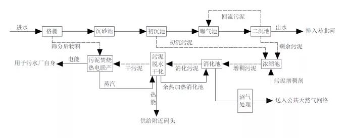 德國(guó)k?hlbrandh?ft/dradenau 污水處理廠位于德國(guó)漢堡,應(yīng)屬德國(guó)最大的污水處理廠,負(fù)責(zé)處理周邊200萬居民生活污水以及歐洲第三大海港工業(yè)廢水。處理水量達(dá)38.2×104m3/d(規(guī)模約為240萬當(dāng)量人口,pe);進(jìn)水水質(zhì)為:cod=850 mg/l,tn=67 mg/l,tp=9.4 mg/l。該廠由漢堡水務(wù)公司經(jīng)營(yíng),改造前是該市最大公共能源消耗單位之一。該廠主流處理工藝為活性污泥法,生化段出水投加化學(xué)藥劑除磷。污泥處理包括剩余污泥厭氧消化產(chǎn)沼氣、沼氣熱電聯(lián)產(chǎn)、消化后污泥繼續(xù)干化、焚燒用于能量回收。該廠污水、污泥處理全工藝流程如圖2所示。
