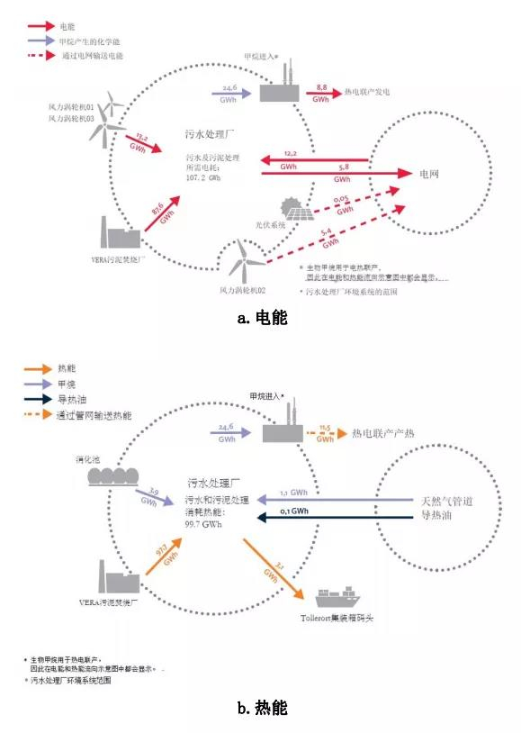 k?hlbrandh?ft/dradenau污水處理廠對(duì)剩余污泥進(jìn)行厭氧消化,同時(shí)收集廠外生物廢棄物與污泥共消化以增加沼氣產(chǎn)量,并實(shí)現(xiàn)沼氣轉(zhuǎn)換為天然氣對(duì)外輸送。后續(xù)消化熟污泥施以焚燒處置,進(jìn)一步熱電聯(lián)產(chǎn)回收電能和熱能;電能彌補(bǔ)自身電耗使用,熱能則被輸送至污泥干化設(shè)備,可完全滿足高溫干化需要;污泥干化后的低溫余熱可繼續(xù)供消化池保溫使用。如此設(shè)計(jì),可實(shí)現(xiàn)電能與熱能高效回收利用。此外,自2009年起該廠富余熱能還向附近碼頭輸出供應(yīng)。圖3為該廠2018年電能與熱能流向示意圖。該廠污泥焚燒產(chǎn)能遠(yuǎn)遠(yuǎn)大于沼氣熱電聯(lián)產(chǎn),且應(yīng)用太陽能、風(fēng)能等清潔能源,實(shí)現(xiàn)能源回收的同時(shí)進(jìn)一步減少co2排放。2018年該廠總電耗為107.2 gw·h/a,產(chǎn)電量為115 gw·h/a,電能自給率達(dá)107%;總熱耗為99.7 gw·h/a,產(chǎn)熱量為113 gw·h/a,熱能自給率達(dá)113%??梢?,該廠通過自身進(jìn)水中高濃度有機(jī)物(cod=850 mg/l)、外源有機(jī)廢棄物、太陽能、風(fēng)能等綜合利用,已超越能源中和目標(biāo)并可向外供氣(ch4)和熱。預(yù)計(jì)未來該廠將達(dá)到發(fā)電量大于耗電量的30%,熱能供應(yīng)范圍也將進(jìn)一步擴(kuò)大。