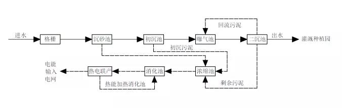 ①沼氣熱電聯(lián)產(chǎn)(chp)。該廠配備有4個(gè)污泥厭氧消化池,總池容6 200 m3。厭氧消化溫度控制為35 ℃,沼氣中ch4含量65%~68%。chp產(chǎn)生電能和熱能,其中,熱能用于加熱消化池,電能則輸入公共電網(wǎng)。