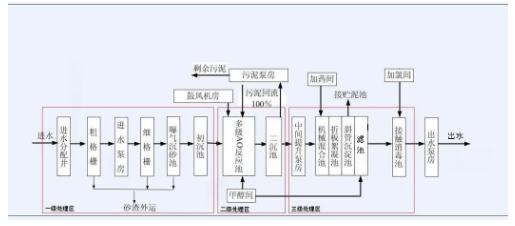 典型的污水廠處理工藝流程是上述方法的組合。以某一級a標(biāo)準(zhǔn)污水處理廠為例,從進(jìn)水到出水主要分三級處理區(qū),一級處理區(qū)主要應(yīng)用物理法(包括攔截、沉淀、除砂等)及一定的化學(xué)法(初沉池前絮凝);二級處理區(qū)是污水處理工藝核心,主要是以活性污泥為主的生化反應(yīng)(酶促反應(yīng));三級處理區(qū)主要應(yīng)用物理化學(xué)法,通過混凝、過濾、消毒等工藝手段對污水進(jìn)行深度處理。落實到具體處理工程中,各級各類技術(shù)需針對不同污染物和污染情況進(jìn)行應(yīng)用和改進(jìn)。