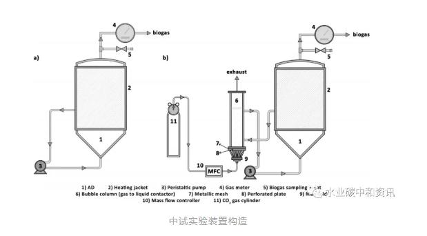 眾所周知,co2是在消化過程中伴隨著甲烷產生的產物。而另一方面,利用厭氧消化進行co2捕集固定是一種潛力十足的碳減排策略。兩個處理食品垃圾的厭氧消化試驗進行了225 d監(jiān)測,實驗組定期使用氣泡柱充入co2(fernandez et al.)。實驗組測試ch4產率為0.56±0.13 m3ch4/kgvs·d(對照組為0.45±0.05 )沼氣中ch4濃度為68%,額外攝取了外源co20.55 kg,h2濃度增加了2.5 倍,這歸因于co2溶解以及酸化與產氫途徑改變。