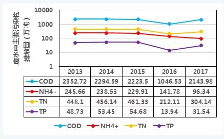 根據(jù)2013-2017年《中國(guó)統(tǒng)計(jì)年鑒》,我國(guó)廢水排放總量保持在700億噸,其中廢水中cod、氨氮(nh4+)、總氮(tn)、tp排放量如下圖,可見(jiàn)2015年國(guó)務(wù)院發(fā)布了《水污染防治行動(dòng)計(jì)劃》(簡(jiǎn)稱(chēng)“水十條”)后,這幾種污染物排放量得到了削減。