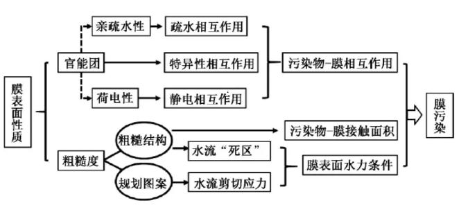 因此,全面總結(jié)膜污染與膜表面性質(zhì)相關(guān)性方面的研究進(jìn)展,對膜材料研發(fā)和膜污染控制具有重要的指導(dǎo)意義。根據(jù)污染物不同,膜污染類型可分為有機(jī)污染、無機(jī)污染、結(jié)垢污染和生物污染4大類。有機(jī)污染主要由進(jìn)水中的腐殖質(zhì)、多糖和蛋白質(zhì)等溶解性有機(jī)物導(dǎo)致,對應(yīng)膜污染研究中常用的模型污染物分別為腐殖酸(ha) 或富里酸(fa) 、海藻酸鈉(sa) 和牛血清蛋白(bsa) 。無機(jī)污染是由水體中的鋁、鐵、硅等無機(jī)膠體和微粒造成的污染,而結(jié)垢污染一般指的是鈣等二價陽離子的碳酸鹽、硫酸鹽和磷酸鹽以及硅酸等物質(zhì)在膜表面的結(jié)晶或沉積。生物污染則由粘附在膜表面的微生物及其代謝產(chǎn)物引起,二者共同形成生物膜后會進(jìn)一步加重生物污染。在實際應(yīng)用中,通常出現(xiàn)的是由多種污染物共存造成的復(fù)合污染,并且進(jìn)水水質(zhì)的差異也會導(dǎo)致膜污染的主要類型有所不同。影響膜污染行為的關(guān)鍵性質(zhì)主要包括膜表面的親疏水性、荷電性、官能團(tuán)種類以及粗糙度(詳見圖1) 。前3項理化性質(zhì)決定了膜材料與特定污染物之間的疏水作用、靜電作用以及氫鍵等特異性相互作用,而膜表面粗糙度則通過粗糙結(jié)構(gòu)、規(guī)則圖案等形貌特征影響污染物與膜的接觸面積以及錯流過濾時膜表面的水力條件。