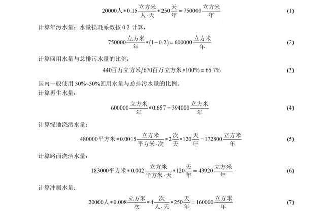 3)西安思源學(xué)院不斷踐行低碳節(jié)能環(huán)保,堅(jiān)持創(chuàng)新,并且在污水處理再生水回用取得很好的成效[13][14][15]。西安思源學(xué)院董事會(huì)在2000年學(xué)校從市區(qū)遷往白鹿塬時(shí)就站在保護(hù)環(huán)境、走可持續(xù)發(fā)展道路的高度,利用有限的自有資金,建設(shè)生活污水處理站。鋪設(shè)專用2m2范圍內(nèi)的雨水,以及一座1800立方米的游泳池、3座600立方米的景觀噴水池定期換掉的剩水收集管網(wǎng)300多米,大小再生水水庫(kù)(包括3座景觀噴水池)5座,擁有各種型號(hào)水泵12臺(tái),再生水專用管線25千米。投資一千三百萬完成日處理量為(2000+2000)立方米的mbr膜生物反應(yīng)器的土建基礎(chǔ)設(shè)施,安裝了2000立方米/天的處理設(shè)備并于2011年9月順利投入運(yùn)行。學(xué)校于2019年11月再次投資580萬元對(duì)污水處理廠原先預(yù)留的2000立方米膜處理設(shè)施進(jìn)行設(shè)備安裝并投入使用。9年半里mbr膜生物反應(yīng)器已經(jīng)處理670萬立方米的污水,產(chǎn)出440萬立方米符合國(guó)家標(biāo)準(zhǔn)再生水并全部回用。西安思源學(xué)院現(xiàn)有2萬名師生。用再生水沖廁,澆灌48hm2綠化地,和澆酒18.3hm2路面。除了西安思源學(xué)院在污水處理再生水回用取得超出國(guó)內(nèi)外許多專家、學(xué)者、制造商的預(yù)料外,還對(duì)所有資金使用、操作程序、運(yùn)轉(zhuǎn)數(shù)據(jù)都有案可查??梢酝ㄟ^以下的計(jì)算,對(duì)單位里的污水量、再生水量、再生水回用量做個(gè)概算。