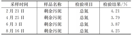 微生物在生長繁殖過程中,會攝取污水中一部分氮來合成自身細胞組分,采用《城鎮(zhèn)污水處理廠污泥檢驗方法》(cj/t 221-2005)第49章中的方法對剩余污泥中氮含量進行檢測,檢測時間為2020年,檢測結(jié)果見表1。