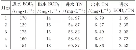 然而在實際運行過程中,受回流液中do濃度的影響,反硝化效率很難達到理論值。如表2所示,再生水廠2021年1月至5月進水bod5/tn的平均值為2.75,低于2.86的理論值。日常該水廠生物池內(nèi)回流比為350%左右,按照式(2)計算理想狀態(tài)下的脫氮效率為78%,在未投加外加碳源的情況下生物系統(tǒng)實際反硝化脫氮效率為77%(見表3)。考慮剩余污泥排放中攜帶的氮含量,進水總氮平均去除率為89%。