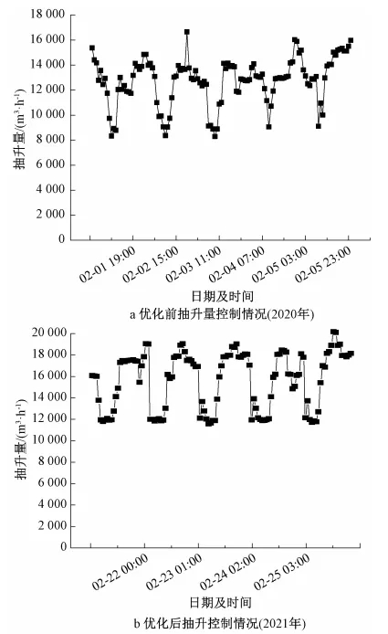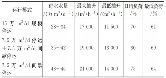再生水廠結(jié)合來水時變化及日變化規(guī)律,通過生物池及膜池間歇停運的方式(見表4),提高日水力負荷至70%以上。并充分利用上游污水管網(wǎng)調(diào)蓄功能,控制瞬時最低抽升量不低于運行曝氣池負荷的60%(見圖3b)。