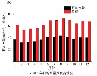 受城市生產(chǎn)活動的影響,污水處理廠在實際運行過程中不同時段、季節(jié)來水水量呈規(guī)律性波動。水力負荷過低或水量時變化系數(shù)過大對回流液do濃度、內(nèi)回流比等脫氮重點指標(biāo)控制會帶來一定困難。以再生水廠2020年來水情況為例,水量峰谷差值比例超過50%(見圖3a),瞬時最低負荷僅為設(shè)計值的30%。不同月份水量差異也較為明顯,最低負荷僅為設(shè)計值的53%(見圖3c)。