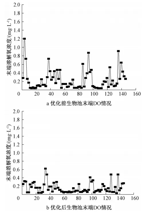通過配水優(yōu)化、抽升控制、生物池倒運等方式,穩(wěn)定生物池水力負荷。優(yōu)化后,生物池do穩(wěn)定性明顯提高(見圖6b),末端do濃度基本低于0.5 mg/l,滿足反硝化對于do濃度的要求,同時大大降低了回流液中的do對于進水碳源的浪費。