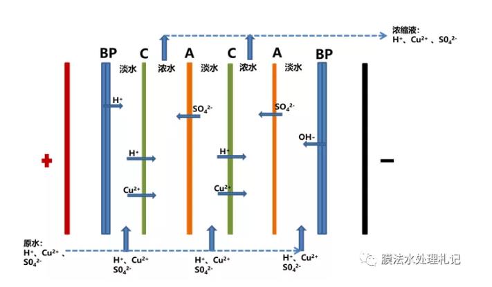 含有高濃度金屬離子的廢水系統(tǒng),對電滲析而言,往往是非常頭疼的事情。一方面部分金屬離子在系統(tǒng)中容易形成膠體,或者運行過程中濃水和極水容易結(jié)垢,造成設備污堵;另一方面多價金屬離子容易進入極水室,從而在陰極室被還原成金屬單質(zhì),從而降低電極板處理效率,且不易恢復。