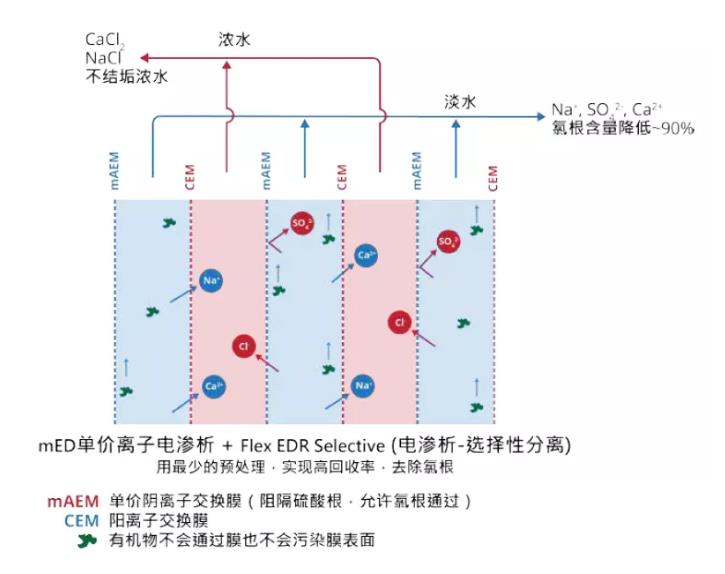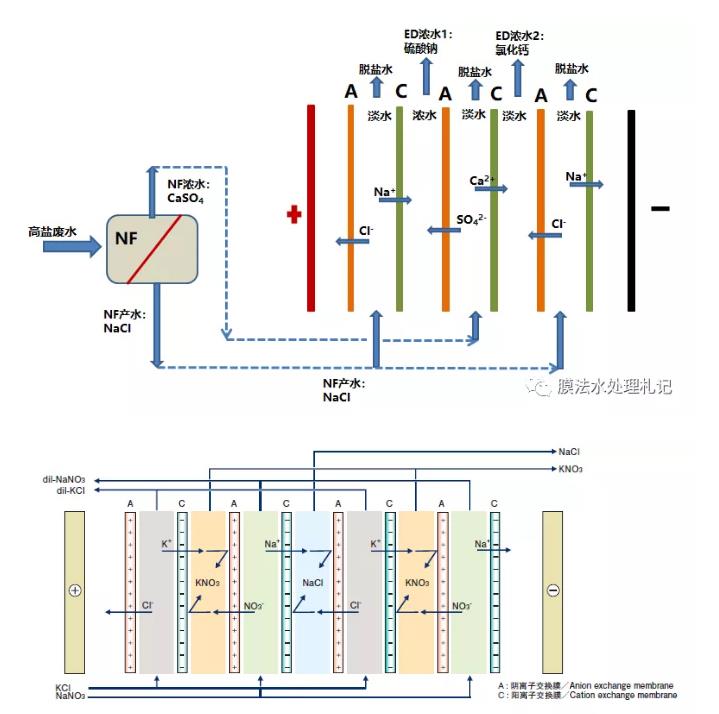 nf-ed的聯(lián)用工藝可以算一個思路,工藝可行性沒有問題,它其實是置換電滲析(第二張圖)的延伸應用。這種工藝在廢水處理需求中落地性會受限于多種因素,如廢水組成、濃水溶液的純度、脫鹽水的處理等。