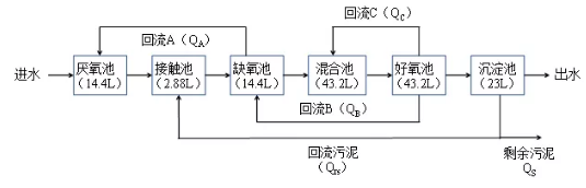 小試裝置為變形uct工藝,由有機(jī)玻璃材質(zhì)制成,長×寬×高為1.44 m×0.3 m×0.3 m,有效容積為120 l,通過擋板分為5個反應(yīng)區(qū)。小試裝置反應(yīng)區(qū)構(gòu)成及其體積如圖1所示。每個反應(yīng)池設(shè)有攪拌器,在混合池及好氧池底部各均勻布置6個曝氣頭。好氧池末端連接23 l柱狀沉淀池,設(shè)計表面負(fù)荷為0.64 m3/(m2·h)。為避免藻類滋生對試驗產(chǎn)生影響,整個反應(yīng)器池體用黑色遮光布進(jìn)行遮光處理。