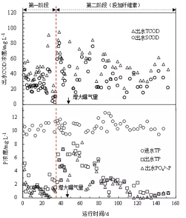 2.1 纖維素對cod與p去除的影響圖2顯示了小試裝置在整個試驗期間出水cod與磷濃度變化。在第一階段進(jìn)水tcod濃度維持在450 mg/l時,出水tcod平均為(39.7±16.1)mg/l,其中scod為(24.8±10.8) mg/l,符合國家一級a排放標(biāo)準(zhǔn)。然而,當(dāng)?shù)诙A段加入纖維素后,cod去除效果明顯惡化,出水tcod最高檢測值高達(dá)95 mg/l(scod為80 mg/l)。為探究加入纖維素后cod去除效果惡化原因,對出水tcod的構(gòu)成進(jìn)行了分析。結(jié)果顯示,加入纖維素后出水ss顯著下降,從(48.25±3.29) mg/l降至(21.34±9.71) mg/l,由此可排除污泥沉降性能惡化導(dǎo)致出水cod升高問題。纖維素富含官能團(tuán)且呈線狀,因此其對污泥具有較好網(wǎng)捕卷掃作用,可促進(jìn)污泥絮體凝結(jié)并提高其緊密度,這一現(xiàn)象通過污泥鏡檢也得到了印證。然而,不論是因纖維素自身作為cod消耗氧氣,還是導(dǎo)致污泥絮體變得緊密都有可能降低氧傳質(zhì),從而弱化了對cod的降解效率。為此,在第46 天對好氧池運行進(jìn)行調(diào)整,將曝氣量提高至0.30~0.50 l/min(添加纖維素前為0.10~0.20 l/min)。結(jié)果,出水cod開始逐漸下降并恢復(fù)至投加纖維素前水平(tcod=49.4 mg/l,scod=34.2 mg/l)??梢?,回收纖維素對曝氣池運行有著積極影響,可提高氧氣傳質(zhì)與利用效率。