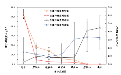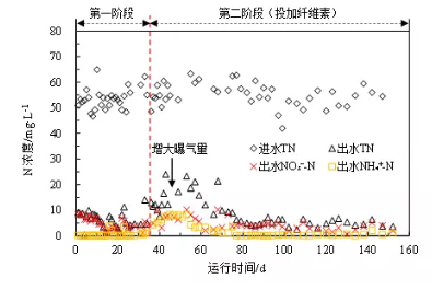 與此同時,纖維素投加對磷去除的影響與cod類似,在纖維素投加初期(第36~50 天),出水總磷(tp)和正磷酸鹽(po3-4-p)濃度均開始惡化,去除率分別降低至51.99%和56.32%。從發(fā)生原因來看,do不足是導(dǎo)致磷去除效率下降的主因,可以從增大曝氣量后出水tp逐漸下降得到驗證。然而,出水tp含量在提高曝氣量后的很長一段時間內(nèi)也沒有恢復(fù)至投加纖維素前水平,而是保持在(2.86±1.22) mg/l左右。為進(jìn)一步分析其原因,在第68 天從曝氣池末端取混合樣進(jìn)行了聚磷菌(paos)活性測定,并與投加纖維素前的活性進(jìn)行了對比。結(jié)果顯示,投加纖維素后,反應(yīng)器中paos比釋磷速率和比吸磷速率分別為11.3 和12.0mg/(gvss?h),與投加前的10.8 、13.4 mg/(gvss?h)相比變化并不是很大。可見,纖維素的投加對paos活性的影響并不大。因此,反應(yīng)器除磷效果恢復(fù)較慢的原因可能與纖維素投加初期導(dǎo)致的跑泥和生物量恢復(fù)較慢有關(guān)。2.2 纖維素對氮去除的影響圖3顯示了在投加纖維素前后裝置對氮去除效果的變化。從整體上看,反應(yīng)器無論是否投加纖維素均能夠很好地完成脫氮,投加前出水tn、nh4+-n和 no3--n平均濃度分別(5.9±3.1)、(0.40±0.96)(4.59±2.22)mg/l,投加后為(7.80±5.46)、(1.30±2.00)、(4.11±2.22) mg/l。只是在纖維素投加初期,出水tn出現(xiàn)明顯惡化,此時出水中nh4+-n明顯增多,這顯然與上述氧傳質(zhì)受限有關(guān)。圖3顯示,在增大曝氣量后對tn的去除效率迅速恢復(fù),主要是因為硝化能力開始恢復(fù)。
