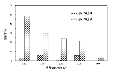 投加纖維素前后的snd效率見圖5,第一階段(未投加纖維素)無論do濃度多大,snd效率均不高(<8%);即使控制do在0.5 mg/l時,snd效率也不過2.8%。相反,第二階段添加纖維素后,snd效率明顯提高,do=0.5 mg/l時達(dá)48.69%;即使do提高至3 mg/l,snd效率依然可以保持在20%。這一結(jié)果深入揭示了纖維素對絮體致密性產(chǎn)生的絮體內(nèi)do梯度之重要作用。