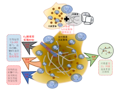 2.3 纖維素對運行的影響纖維素對反應(yīng)器運行影響是兩方面的,似乎均與其對污泥絮體致密程度有關(guān)。圖6總結(jié)了纖維素對反應(yīng)器運行、能耗等方面的影響及其機(jī)理。纖維素通過自身線狀形態(tài)和官能團(tuán)可靠網(wǎng)捕卷掃作用將污泥絮體密實包裹,相當(dāng)于促進(jìn)絮凝,可降低出水ss以及其中所含n、p。