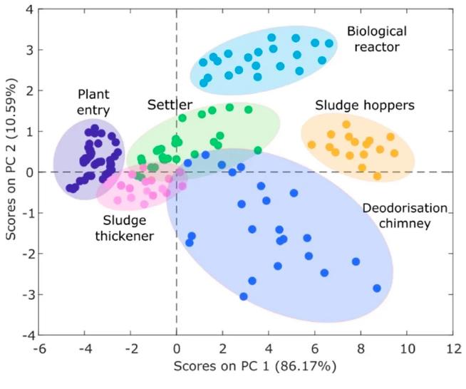 通過pca主成分分析,污水廠可以更直觀地了解不同地點(diǎn)的臭氣源類型: