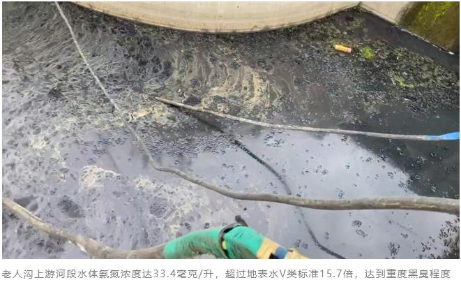 督察組前期暗訪發(fā)現(xiàn),老人溝沿江平路2公里長(zhǎng)的河段水體明顯發(fā)黑發(fā)臭,氨氮濃度最高為33.4毫克/升,超過地表水v類標(biāo)準(zhǔn)的15.7倍,達(dá)到重度黑臭程度。進(jìn)一步排查發(fā)現(xiàn),河道沿線排污納管仍不徹底,存在7個(gè)生活污水直排口。其中,距入槐泗河口約200米處的一處污水井大量溢流,采樣監(jiān)測(cè)結(jié)果顯示,外排污水化學(xué)需氧量、氨氮濃度分別高達(dá)136毫克/升、46.0毫克/升;江陽(yáng)家園西側(cè)排口排水氨氮濃度達(dá)到34.0毫克/升。老人溝上游段新建的提升泵站污水溢流入河,外排污水化學(xué)需氧量、氨氮濃度分別達(dá)到82毫克/升、19.4毫克/升。