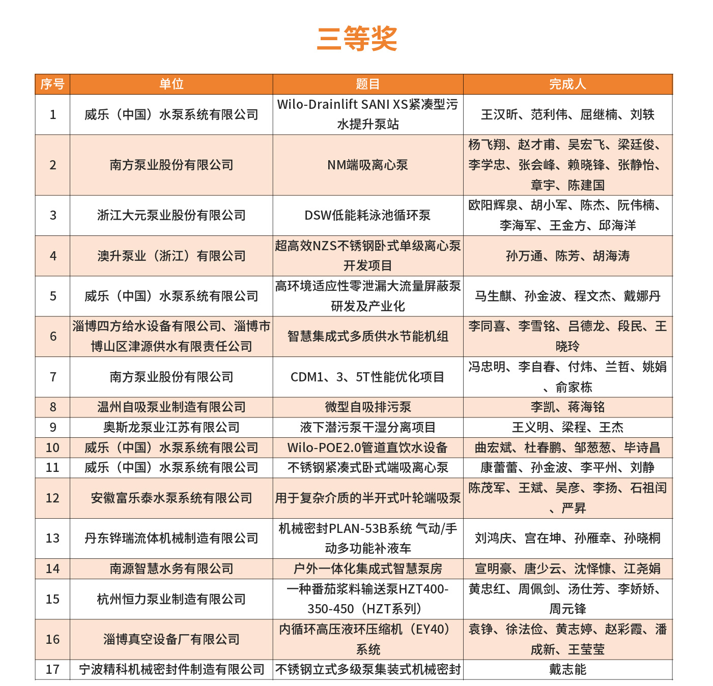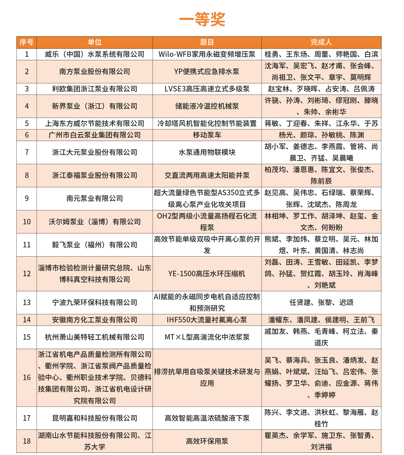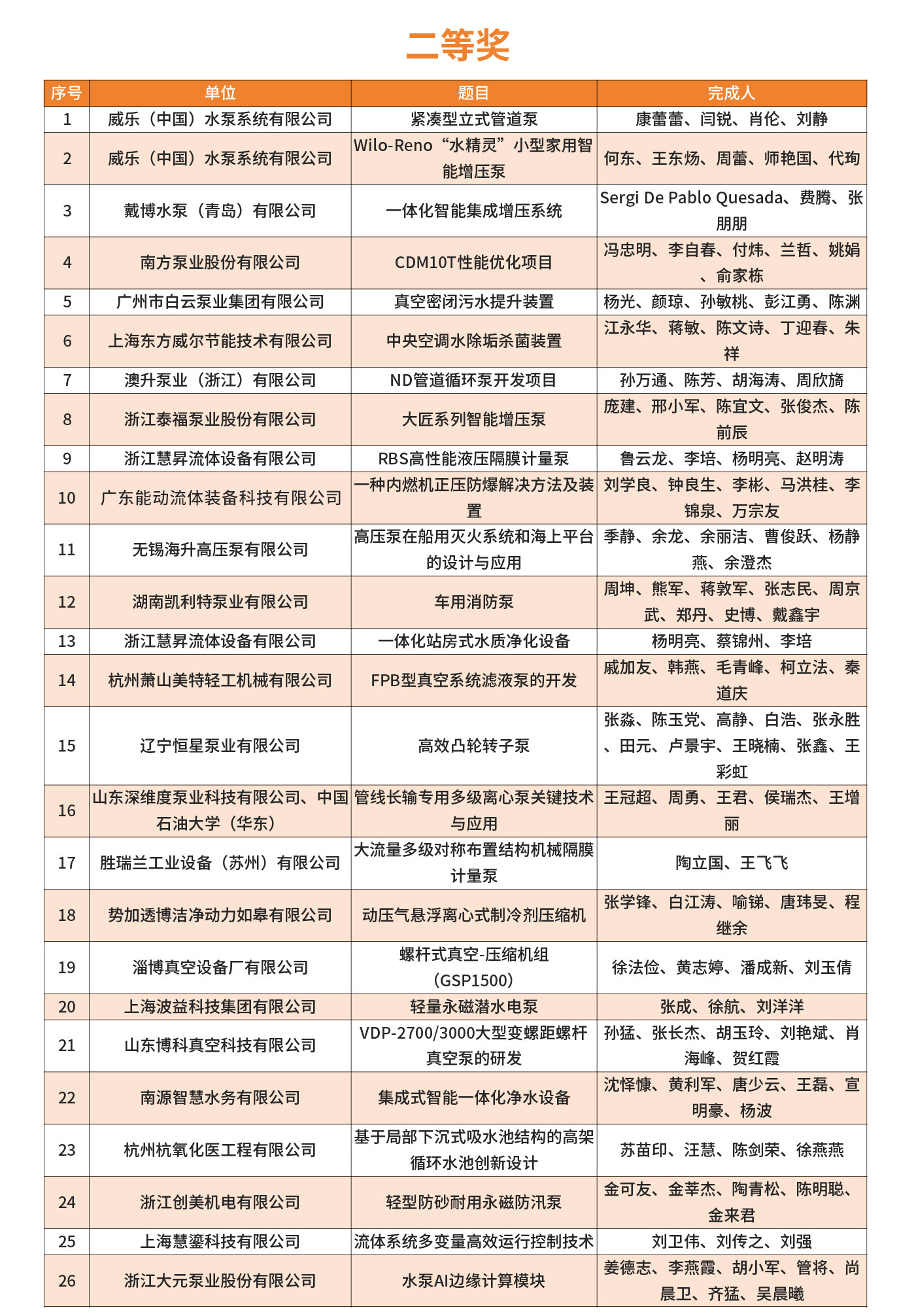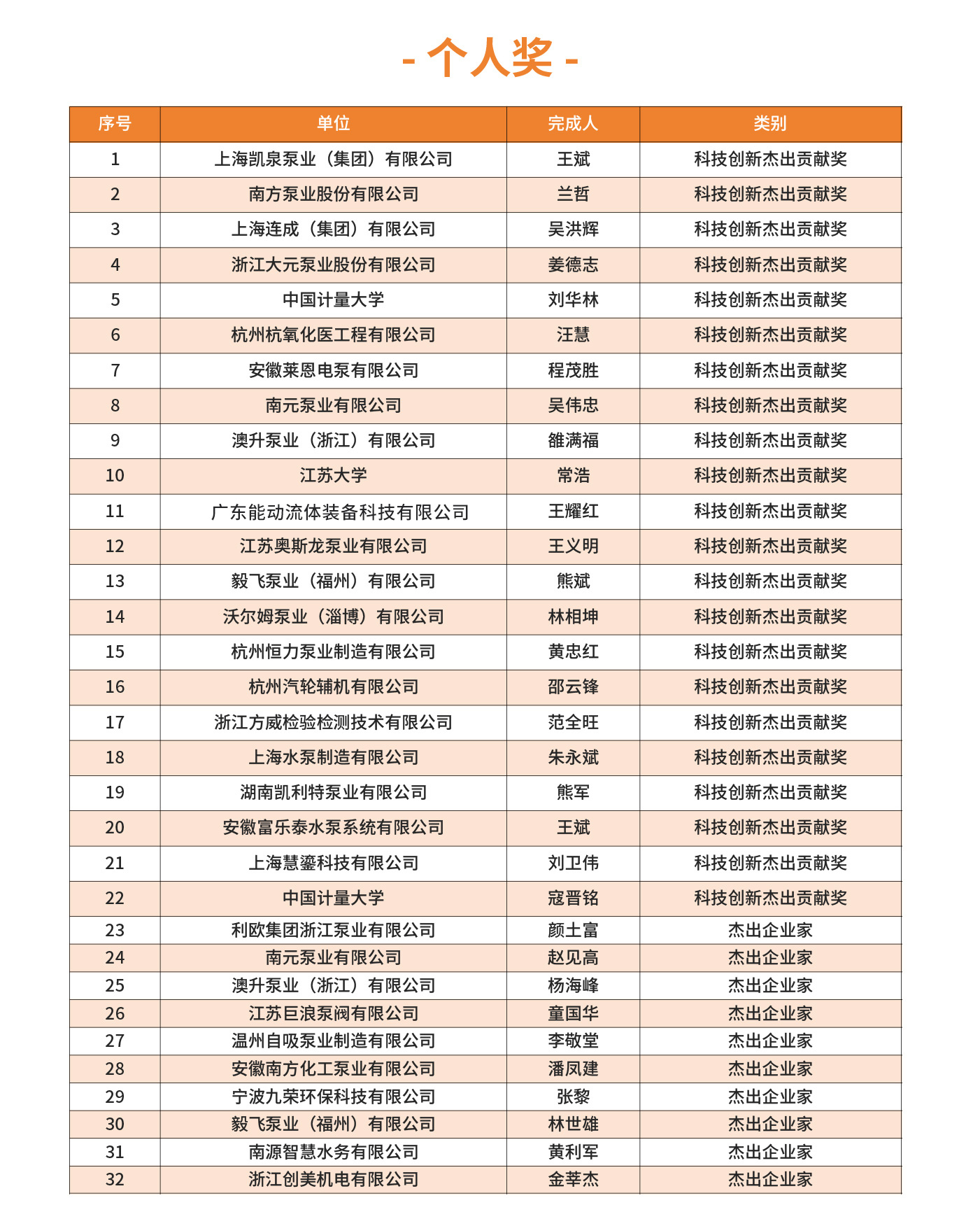 2025年第四屆FLOWTECH CHINA全國流體裝備技術創(chuàng)新獎經過10位嘉賓的專業(yè)評審,共評選出了威樂、南方、利歐、新界、白云、沃爾姆、澳升等在內的一、二、三等獎,凱泉泵業(yè)王斌、南方泵業(yè)蘭哲、利歐集團顏土富等32位個人獎。